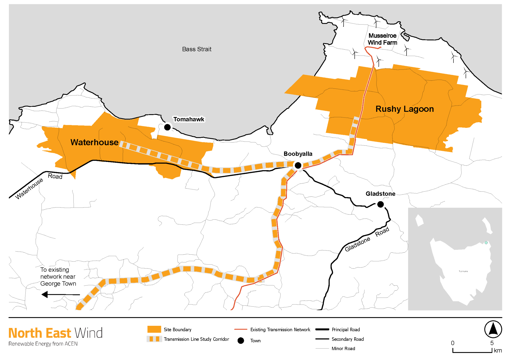 Existing transmission infrastructure in North East Tasmania cannot support new energy generation. A new transmission line will need to be constructed. A study corridor has been identified for a transmission line that will connect the two clusters of North East Wind at Waterhouse and Rushy Lagoon to a switching station at Boobyalla. From here, the corridor will follow alongside the existing 110 kV transmission easement that connects Musselroe Wind Farm part way towards Derby, taking a separate path west at a point between Banca and Winnaleah. The corridor will then extend west to reach the existing high voltage 220 kV transmission network at Long Reach, just outside of George Town.