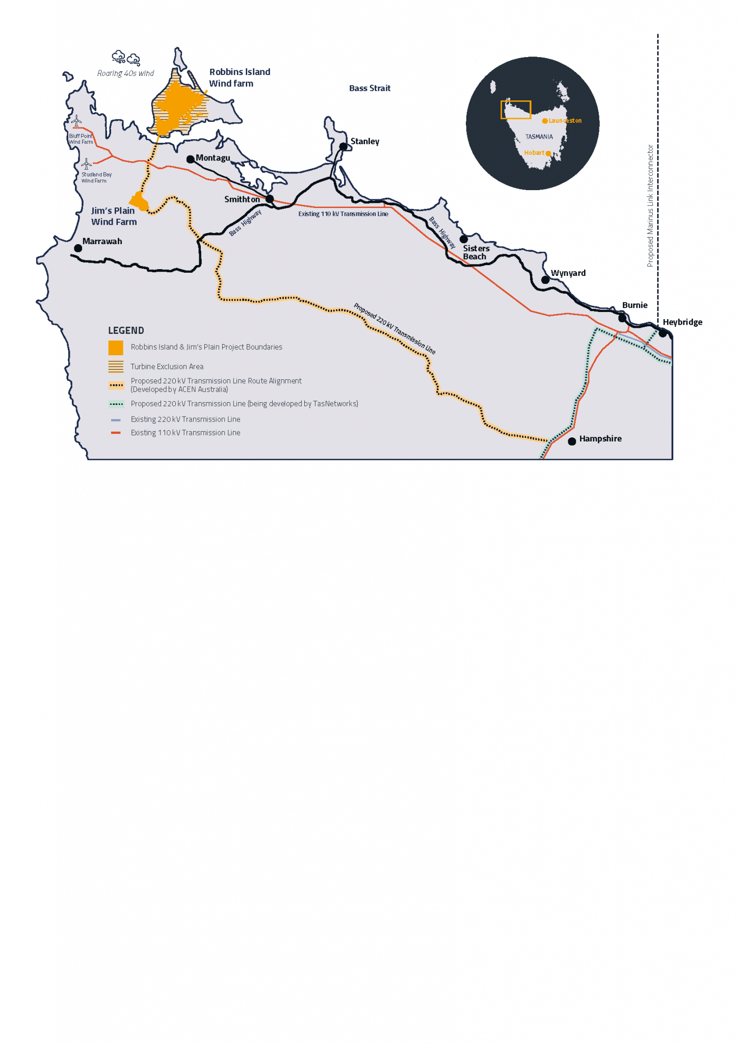 A transmission line approximately 120 km long, to deliver the renewable energy generated by Robbins Island and Jim’s Plain Wind, to the Tasmanian high voltage electricity transmission network at Hampshire Hills.